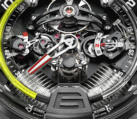 Auch die Minuten werden durch eine retrograde Hand angezeigt. Wenn es um 30 Uhr die 30-Minuten-Marke erreicht, springt es zurück, um mit 30 Minuten auf der anderen Seite der "6" -Markierung fortzufahren. Dies ermöglicht dem Minutenzeiger, den Balg zu vermeiden. Eine ähnliche Funktion findet sich im Chanel J12 Rétrograde Mystérieuse Tourbillon, das auch von Renaud & Papi gemacht wurde.