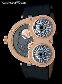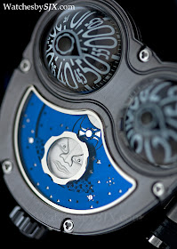 An der Stelle des Datums auf dem HM3 ist Sarpanevas erkennbare Mondphasenanzeige vor dem Hintergrund der Sterne. Unterhalb der Mondphase sitzt ein Mystery Rotor ähnlich mit Sternen verziert.